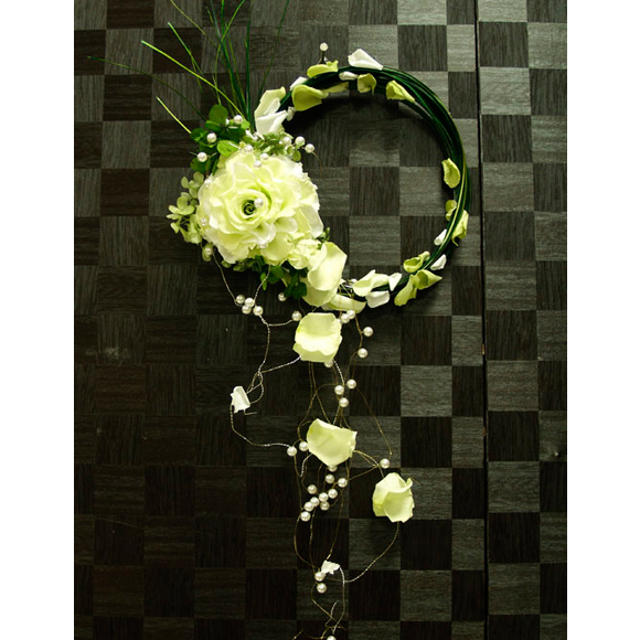 紫陽花で周りをカバーして、パールをワイヤーに絡めて垂らしました。