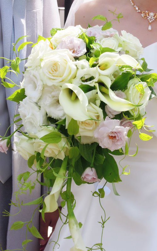 バラ・アバランチェ、ステンレススチール、トルコキキョウ、りきゅう草などを使っています。