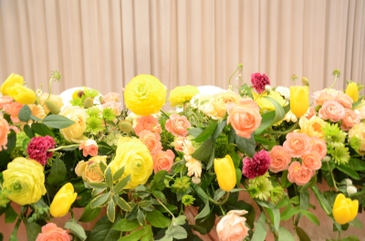メインテーブルと会場装花は、黄色~オレンジメインです。